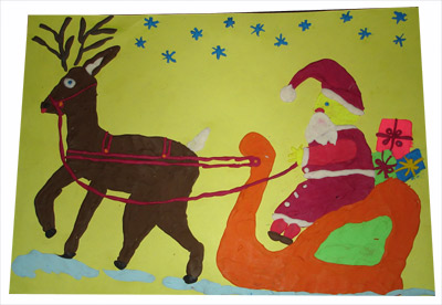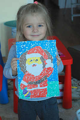 Mama napisała: Majka bardzo lubi rysować, malować i robić różne ciekawe plastyczne prace :) Portret Mikołaja zrobiła wydzieranką z wycinanek, lubi tą technikę, choć jest pracochłonna ale zawsze rozłoży sobie pracę na kilka razy wtedy jej się nie znudzi :) Portret robiła sama bardzo zresztą się starała pilnować linii itp Razem z córeczka uwielbiamy sporty wszelakie , zimą oczywiście sanki , uwielbiamy czytać książki i bawić się w teatrzyk, do którego sama robię córci i synkowi akcesoria :)